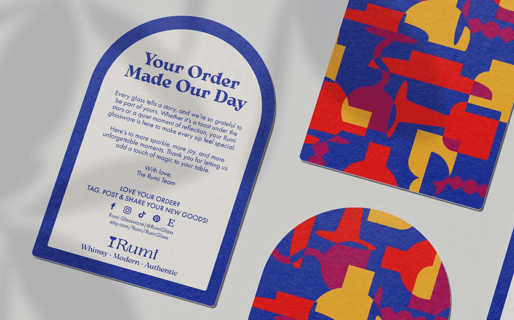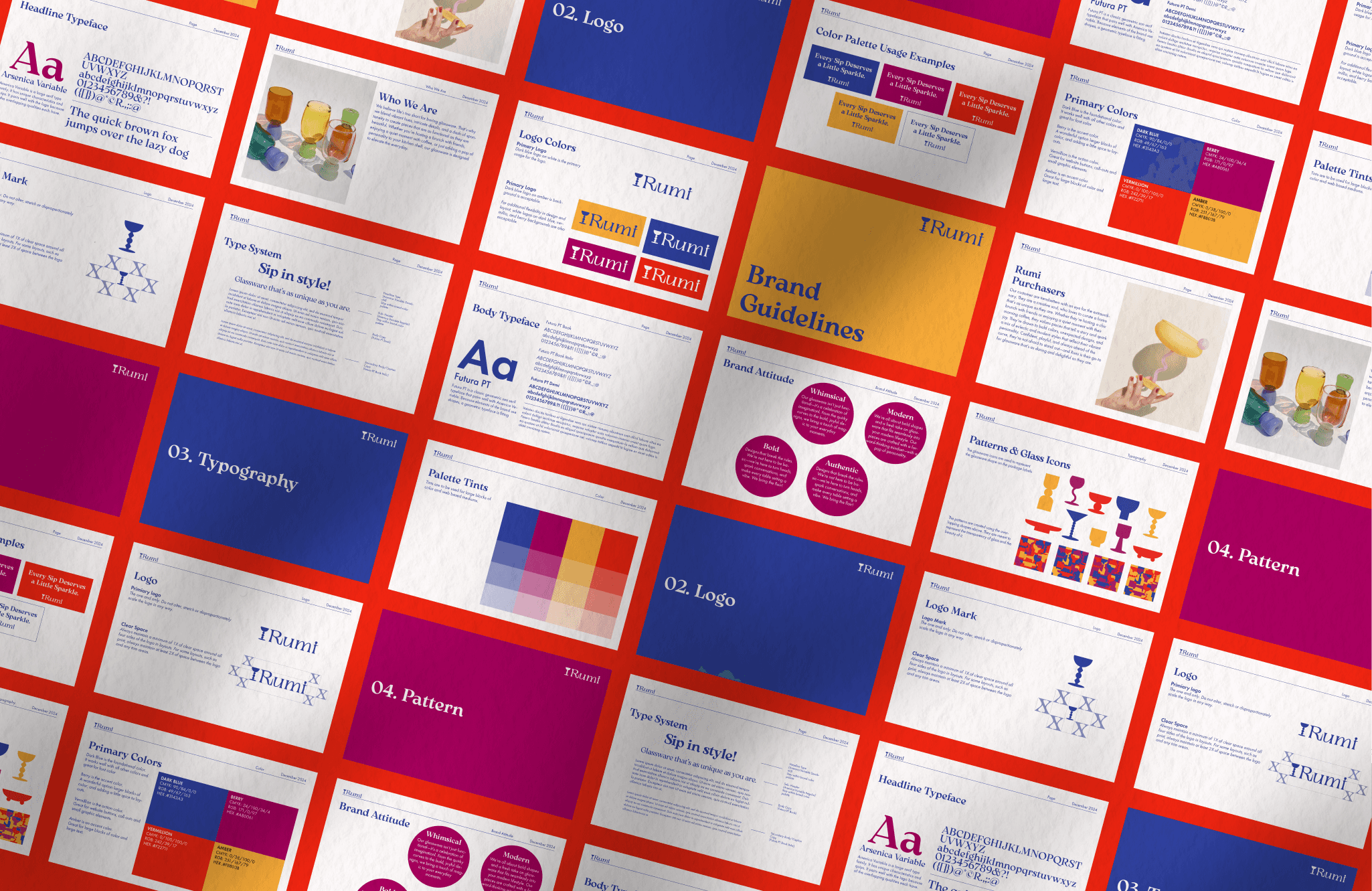 Rumi is a glassware brand that creates unique, homemade glassware. As Rumi continues to grow, the brand needed a refresh to unify its identity and strategy. The redesign introduces a modernized logo with a playful twist, a bold and vibrant color palette, and a harmonious blend of elegant serif and clean sans-serif fonts. This cohesive update is designed to amplify Rumi’s whimsical charm, ensuring it stands out as a go-to brand for design-savvy customers everywhere.